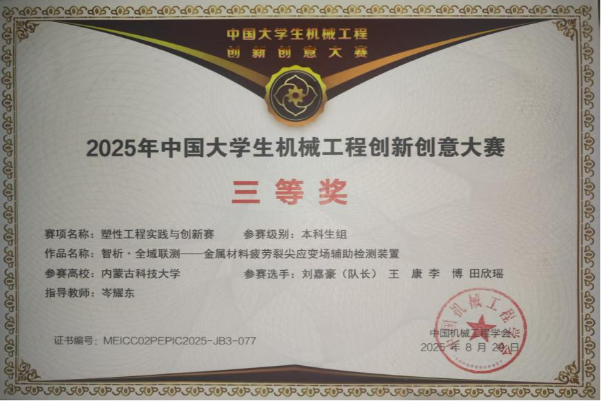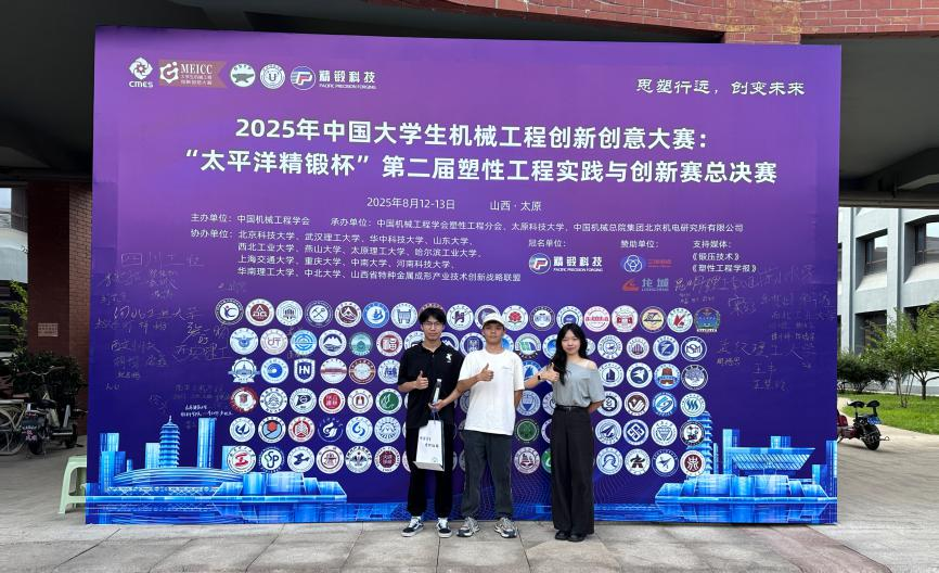 近日,由中国机械工程学会主办,中国机械工程学会塑性工程分会、太原科技大学和中国机械总院集团北京机电研究所有限公司承办的2025年中国老员工塑性工程创新创意大赛——“太平洋精锻杯” 第二届塑性工程实践与创意赛总决赛在太原科技大学举行。公司岑耀东副教授指导刘嘉豪、王康、李博、田欣瑶等员工申报的作品“智析·全域联测——金属材料疲劳裂尖应变场辅助检测装置”获得本科生组全国三等奖,这也是我院继2024年获得首届中国老员工塑性工程创新创意大赛以来,再次斩获佳绩。