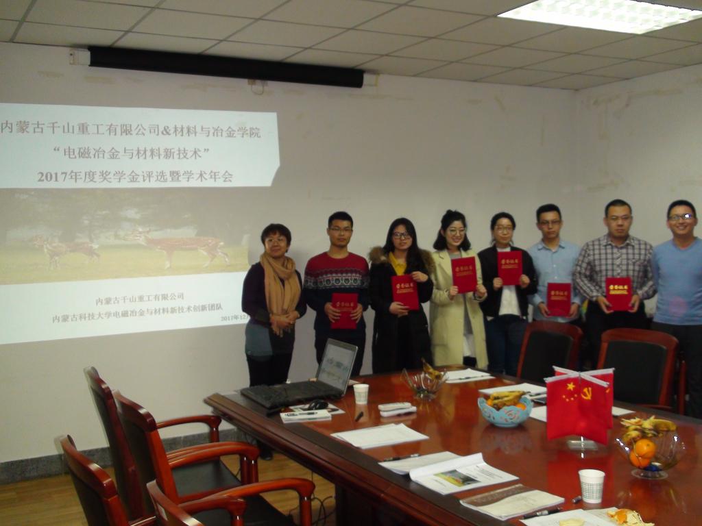 2017年12月27日,由内蒙古千山重工有限公司和EMC易倍官方网站电磁冶金与材料新技术创新团队共同举办了“电磁冶金与材料新技术”2017年度奖学金评选暨学术年会。会议主要分为特邀专家主题报告和研究生工作汇报。本次会议特邀包头市稀土永磁电机有限公司张继鹏总经理、包头铝业高工郭有军、内蒙古北方重工高工郭采光、EMC易倍官方网站科技处处长赵增武作了主题报告。此外,内蒙古千山重工有限公司董事长陈延江、材料与冶金公司经理宋希文出席了学术年会。