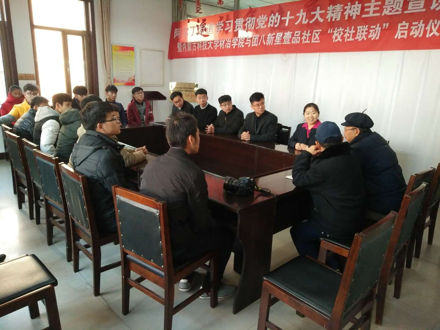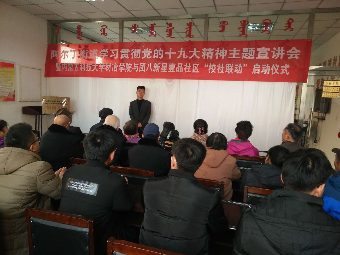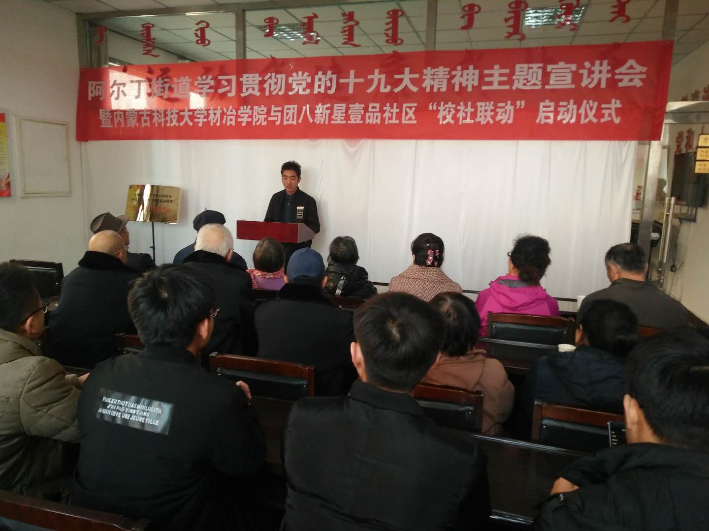 为学习贯彻党的十九大精神与思想,公司于2017年11月19日与团八新星壹品社区联合举行了阿尔丁街道学习贯彻党的十九大精神主题宣讲会暨EMC易倍官方网站材冶公司与团八新星壹品社区“校社联动”启动仪式。参加本次活动的有公司副书记副经理张鑫书记,团八新星壹品社区党委高丽波书记,以及公司老师,同学和团八新星壹品社区部分党员和居民代表。