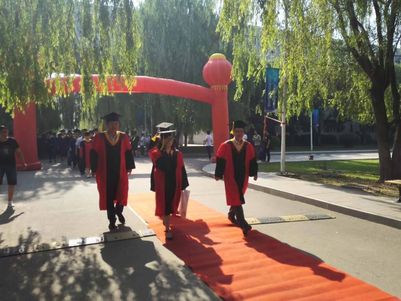 毕业典礼前,公司436名毕业生身穿学位服,踏着红地毯,在“这一路走来”的歌声中,穿过“社会主义核心价值观宣传长廊”、在“拒绝平庸追求卓越,百炼成钢”条幅上签下自己的名字,走向毕业典礼现场。公司用这种隆重而特殊仪式,为2017届毕业生送行,为材冶公司毕业生学业有成喝彩。这是公司第一个公司举办隆重毕业典礼