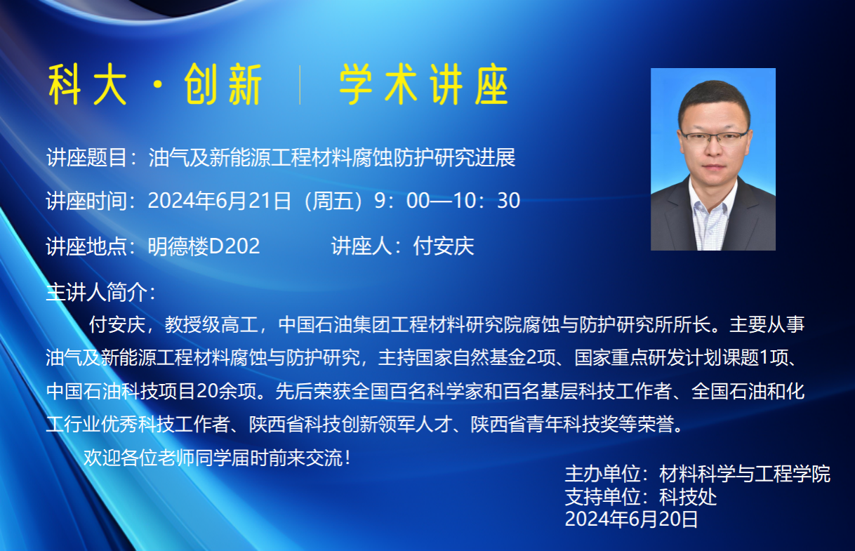 讲座题目:油气及新能源工程材料腐蚀防护研究进展